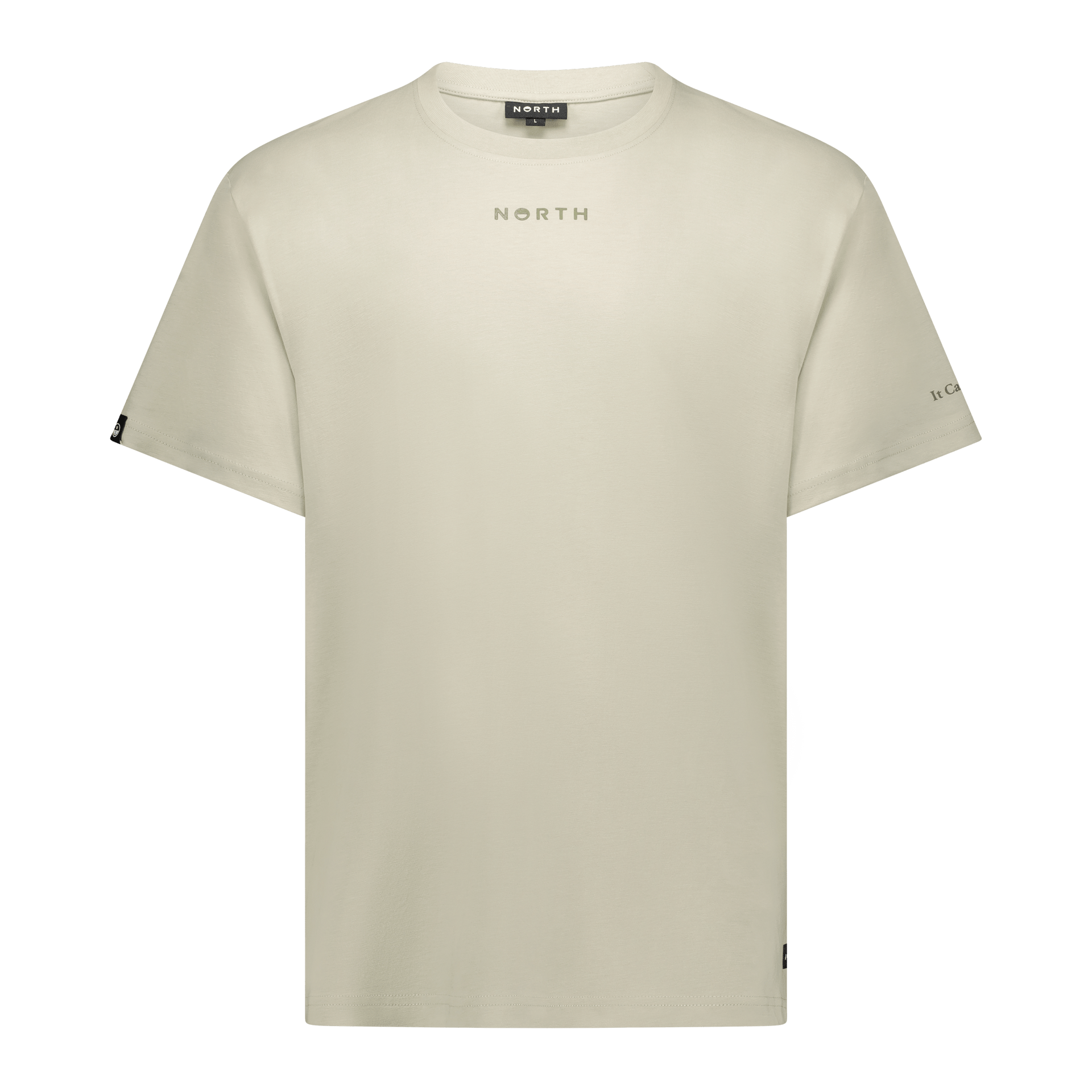 100% Organic 220gsm Cotton Tee with small NORTH wordmark printed centre front and small NS logo printed on back.