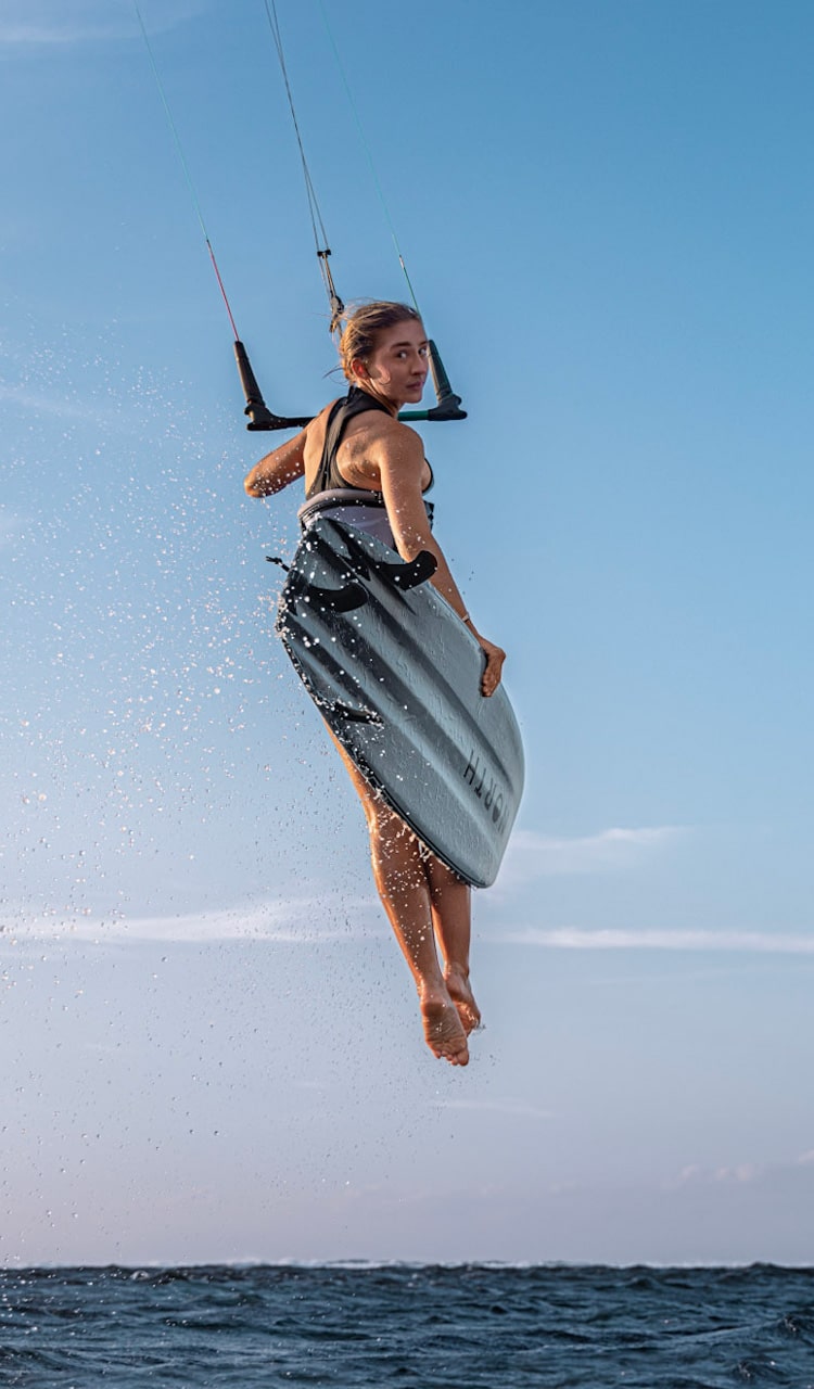Durable low-volume, high-density PVC core design for faster feedback and more direct rider response. Its thin profile and lighter weight makes handling in the air so much easier. It also makes the board less buoyant on the water, which means softer landings that are easier on your body, because there is less counter-force on landings.